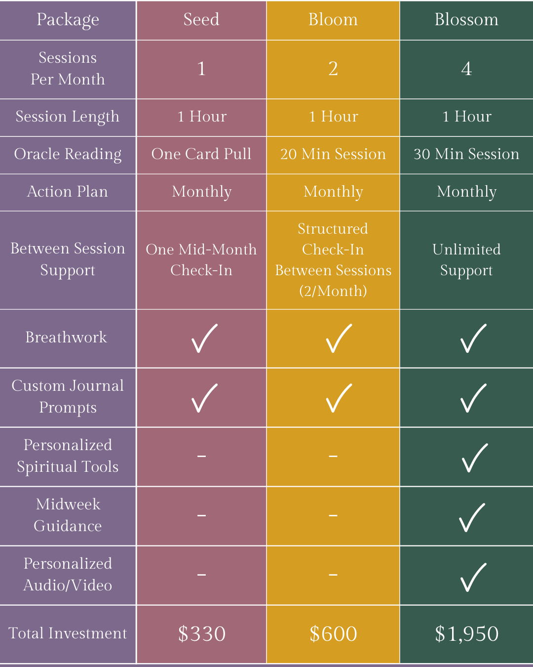 Choosing the right level of support isn’t about picking the “best” option, it’s about honoring where you are right now. Each package was designed to support a different season of growth. Take a moment to notice what feels most supportive for you at this stage.